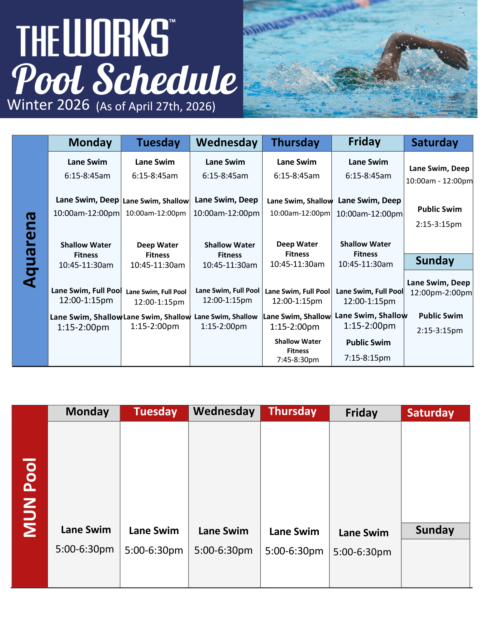The Works Pool Schedule Winter 2026 starting January 5th, 2026