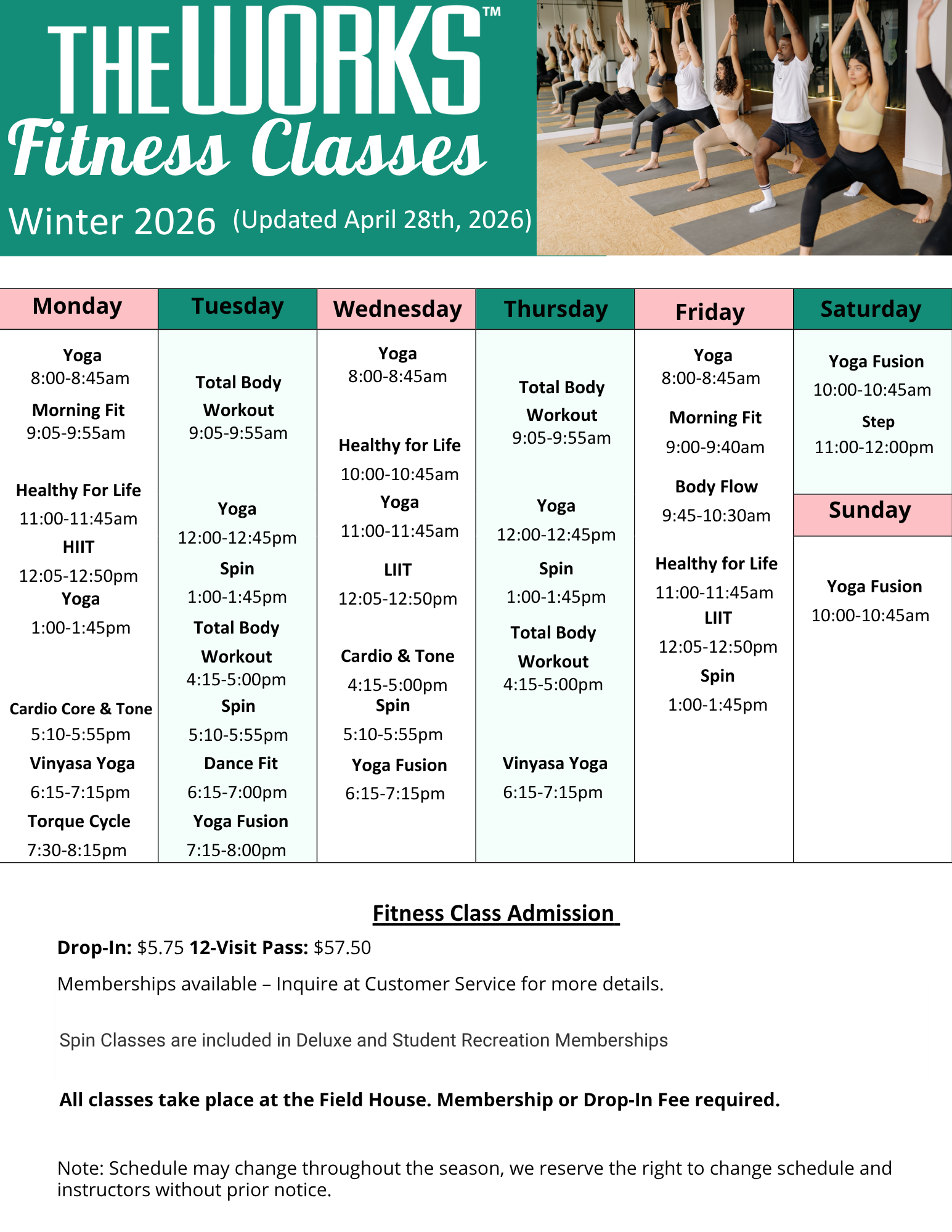 The Works Fitness Class Schedule Winter 2026 starting January 5th, 2026
