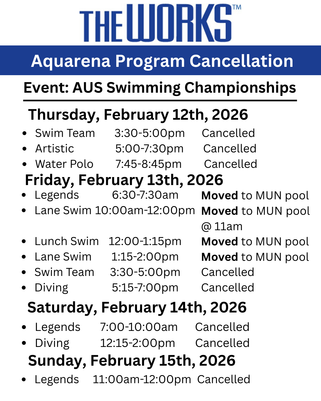 - Host site for the 2026 Atlantic University Sport (AUS) Swimming Championship (Friday – Sunday, February 13–15)